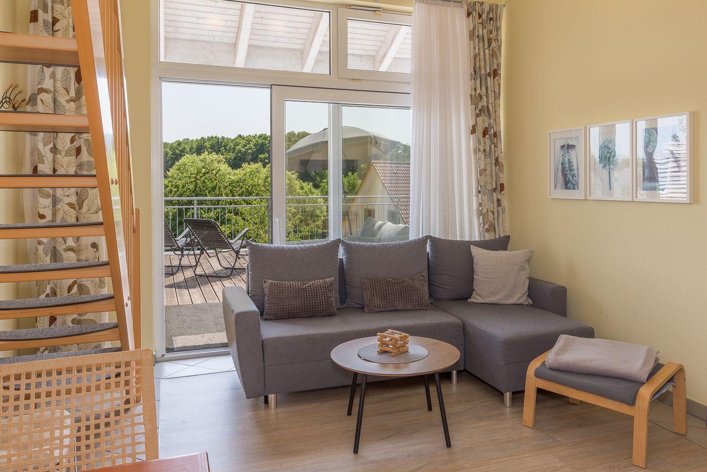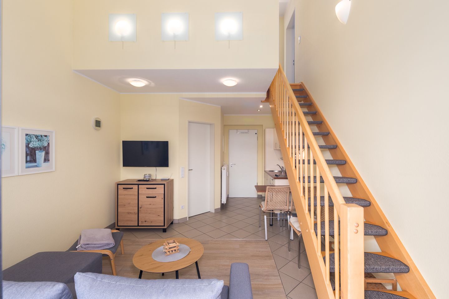 Das Apartment bietet Platz für bis zu 4 Personen auf 2 Etagen mit offener Schlafempore und einem abgegrenztem Kinderzimmer, Wohn-/Essbereich, Pantryküche, Badezimmer, Balkon, PKW-Stellplatz. Für den perfekten Start in den Urlaub sind die Betten bei Anreise frisch bezogen und eine Erstausstattung Handtücher liegt bereit. Die Nutzung des Schwimm-und Fitnessbereichs sowie der Saunalandschaft sind im Mietpreis inklusive.