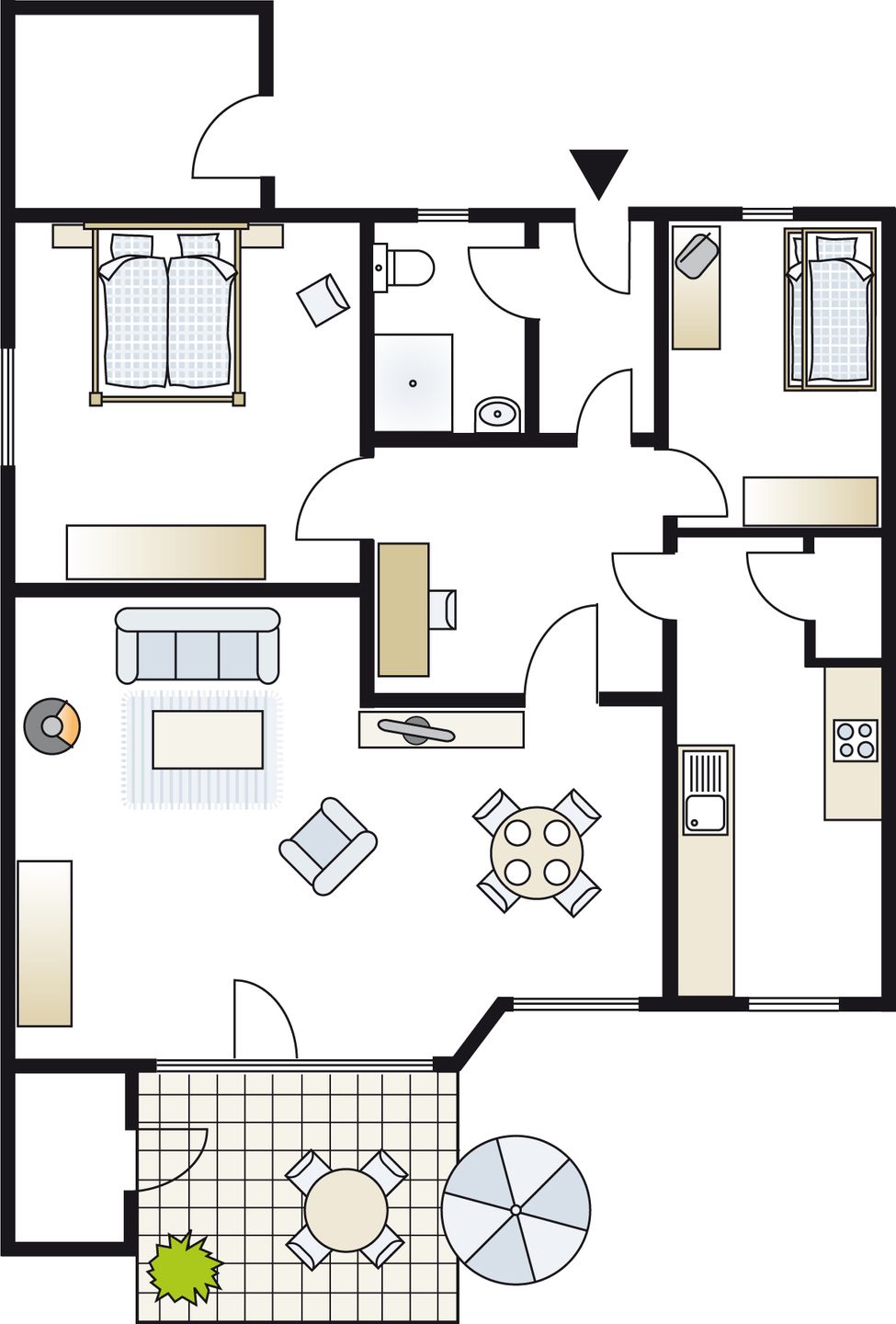 Die Doppelhaushälfte im skandinavischen Stiel bietet Platz für bis zu 4 Personen auf einer Etage mit 2 Schlafzimmern, 1 Badezimmer, Wohn-/Essbereich mit Kamin und Einbauküche, Abstellraum, Terrasse und PKW-Stellplatz.