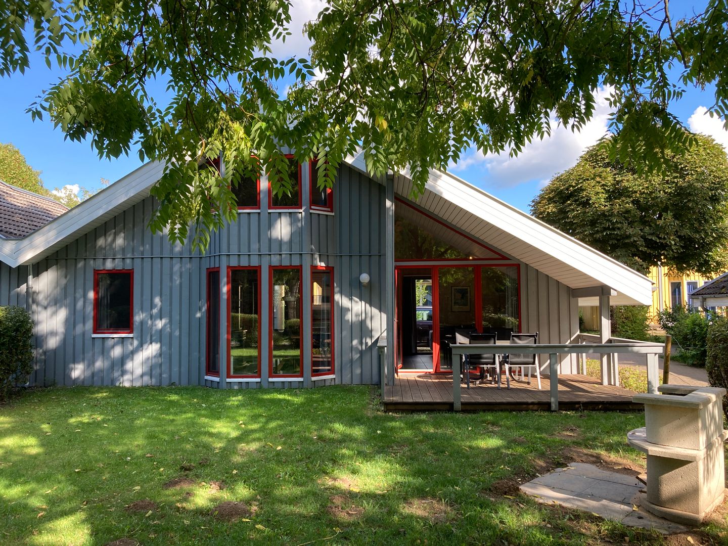 Freuen Sie sich auf ein modern eingerichtetes Ferienhaus in skandinavischer Holzbauweise über zwei Etagen mit einer Nutzfläche von ca. 81 m². Das Haus verfügt über eine großzügige Sonnenterrasse in westlicher Ausrichtung. Das etwa 300 m² große Grundstück liegt am westlichen Rand des Ferienparks in erster Reihe zum See.