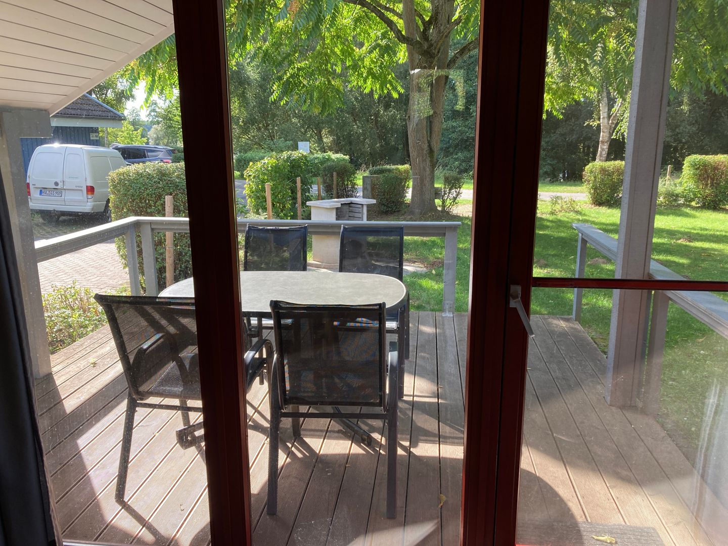 Der Außenbereich bietet eine Terrasse mit Gartenmöbeln, Sonnenschirm und Außengrill. Ein gekennzeichneter PKW-Stellplatz befindet sich direkt am Haus. Neben der Hauseingangstür liegt ein von außen zugänglicher, abschließbarer Abstellraum mit Regalen.