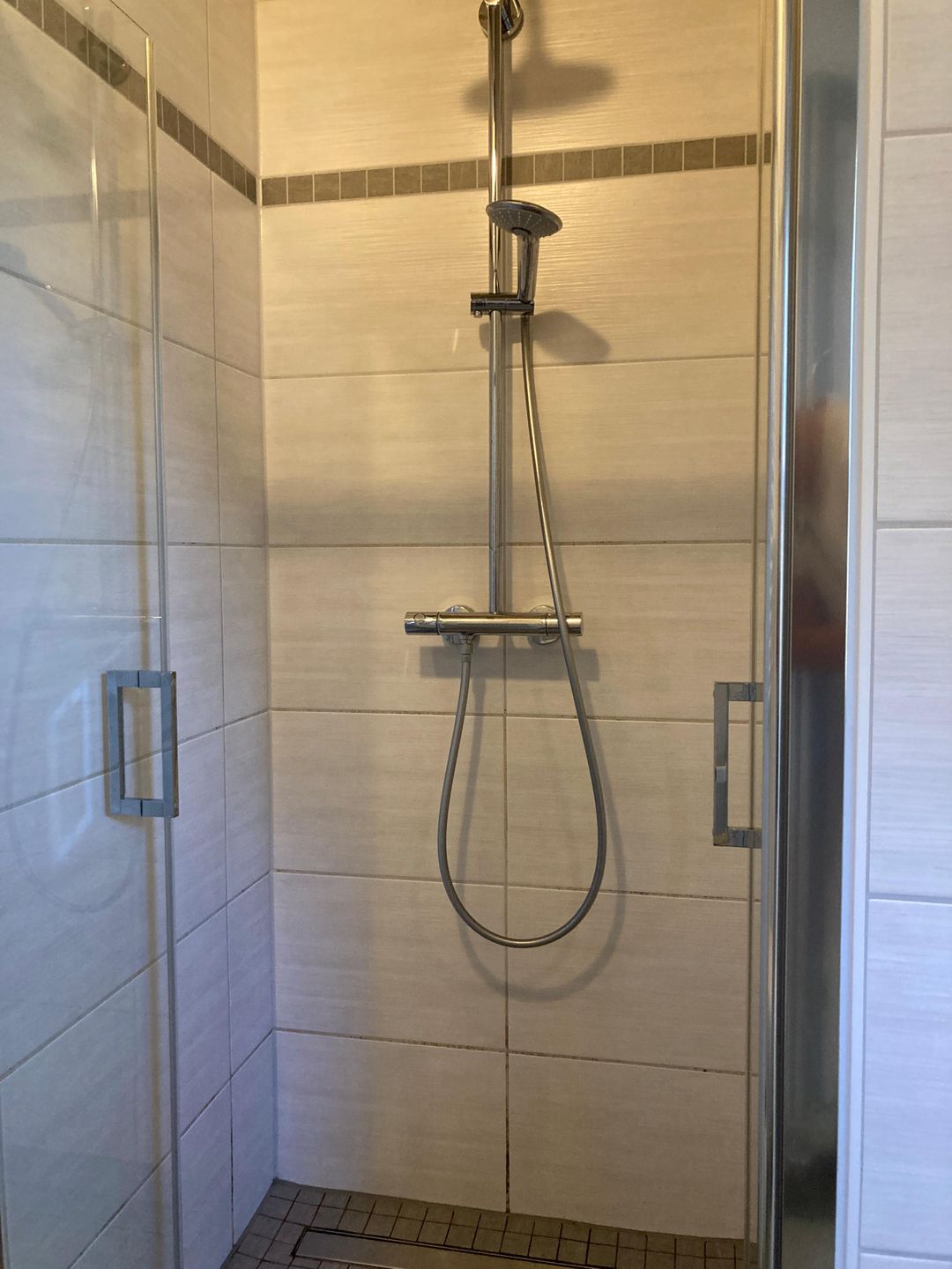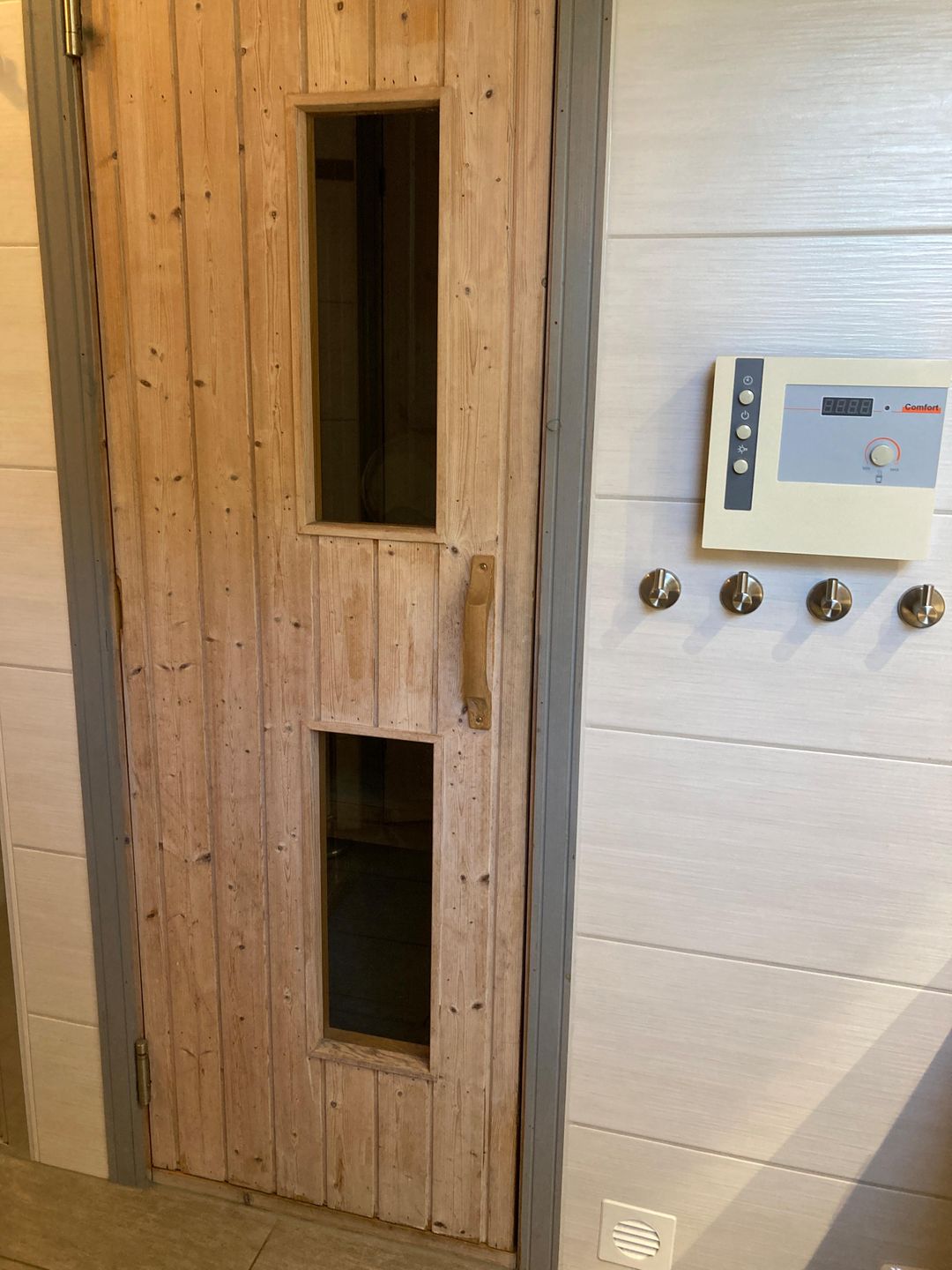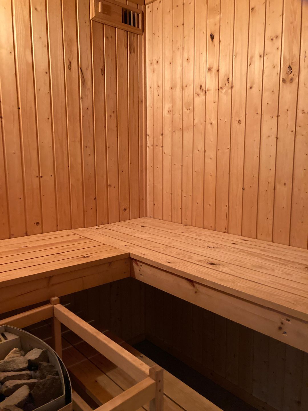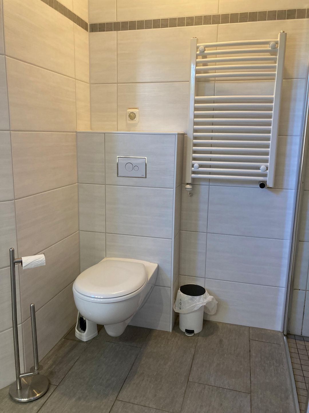 Das im Jahr 2017 komplett neu gestaltete, großzügige Badezimmer verfügt über eine bodengleiche Dusche mit Thermostatarmatur (Regendusche und Handbrause), Fußbodenheizung (auch im Duschbereich), einen beheizbaren Handtuchhalter mit Zeitschaltuhr sowie eine skandinavische Sauna. Unter dem großen Waschtisch stehen praktische Unterschränke zur Verfügung. Zusätzlich befindet sich hier eine moderne Unterbau-Waschmaschine mit einem Fassungsvermögen von bis zu 9 kg.
