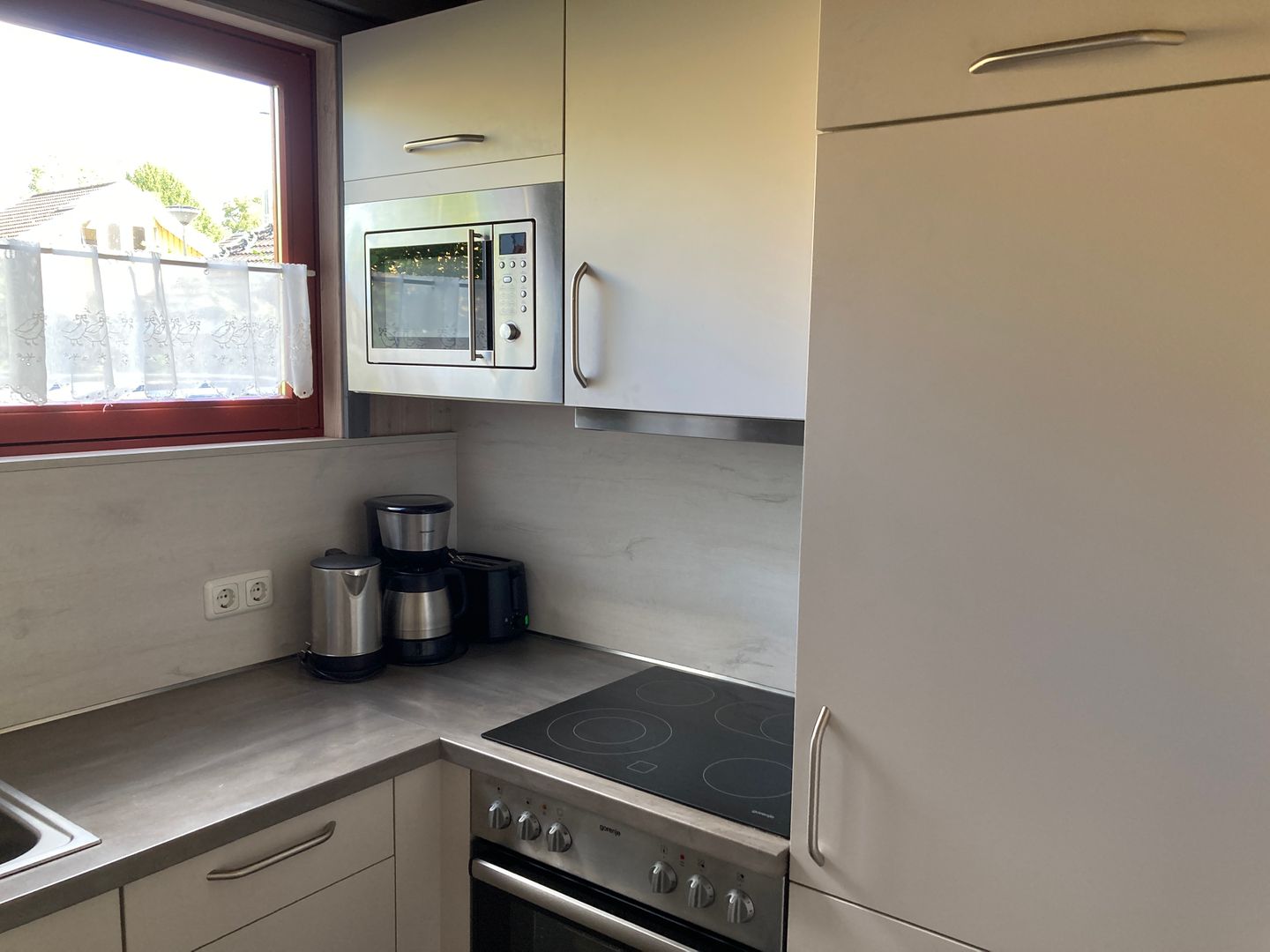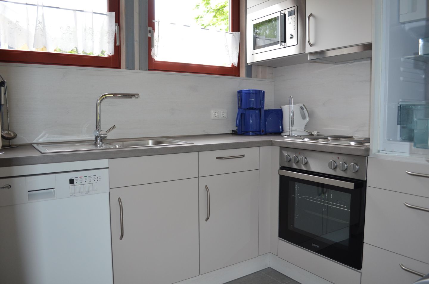 Die moderne Einbauküche ist umfassend ausgestattet mit einem Elektroherd mit Cerankochfeld und Backofen, einem Kühlschrank mit ****-Gefrierfach, einem Einbau-Geschirrspüler sowie einer Mikrowelle. Kaffeemaschine, Wasserkocher und Toaster gehören ebenfalls zur Ausstattung.