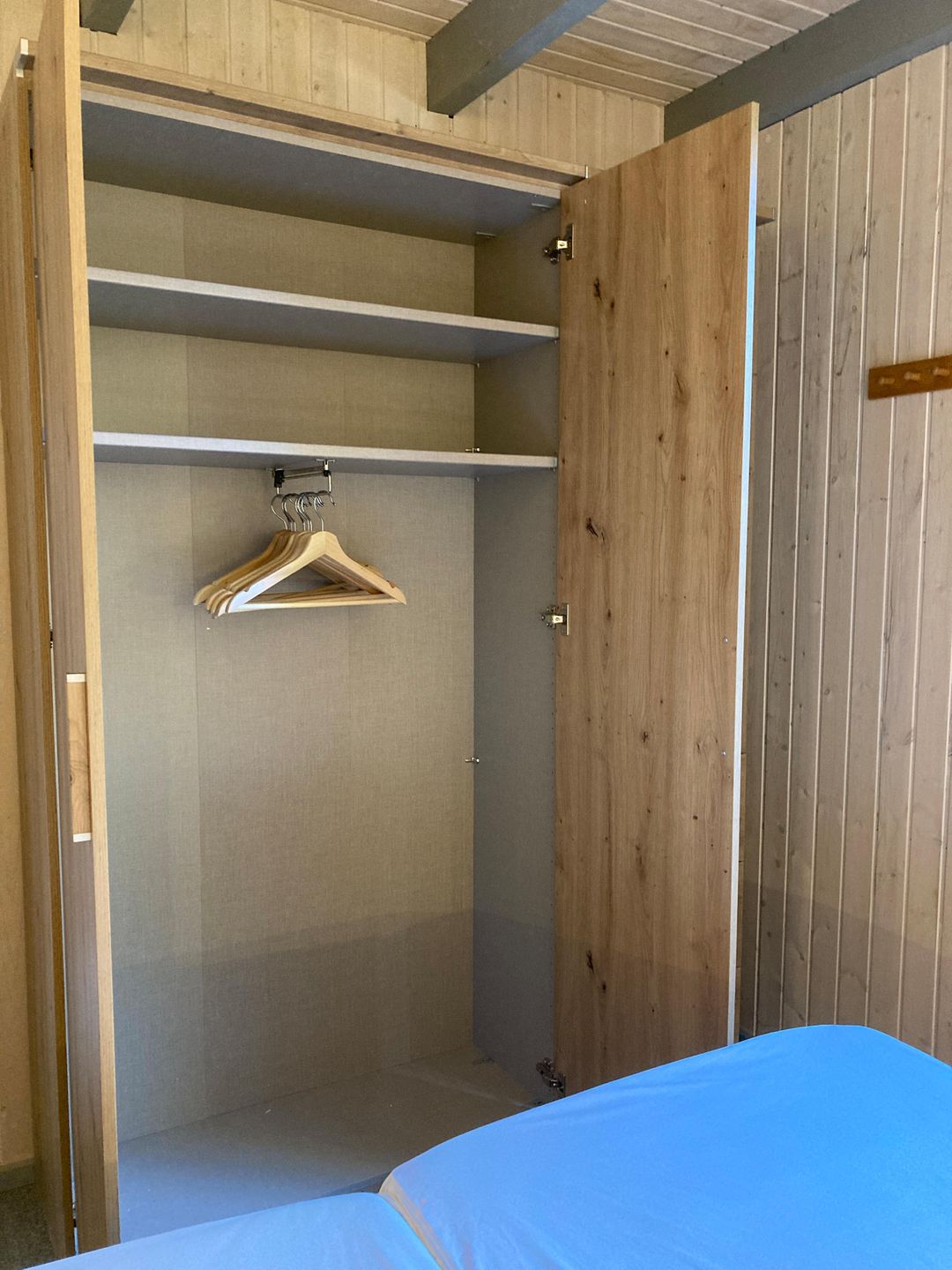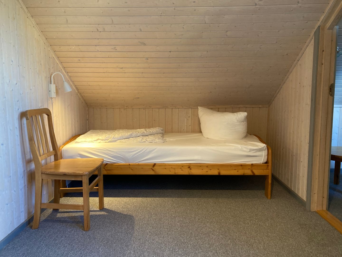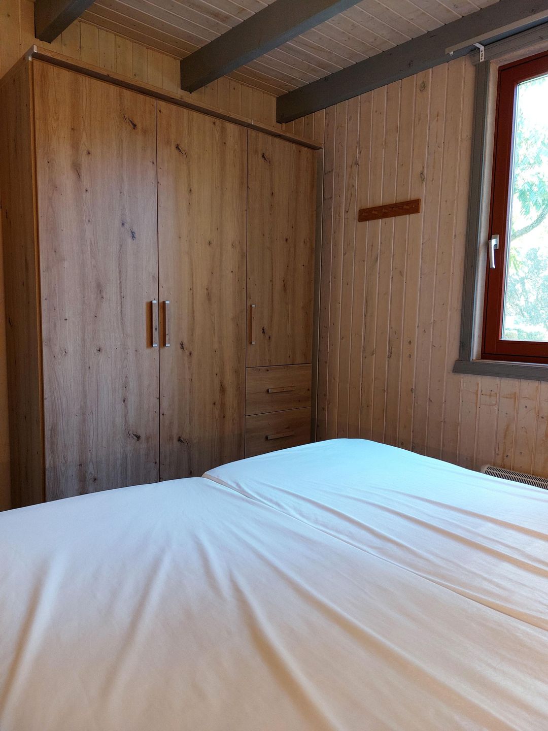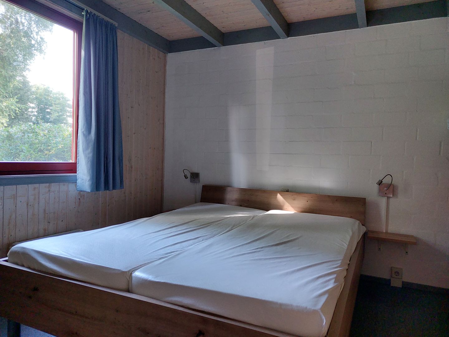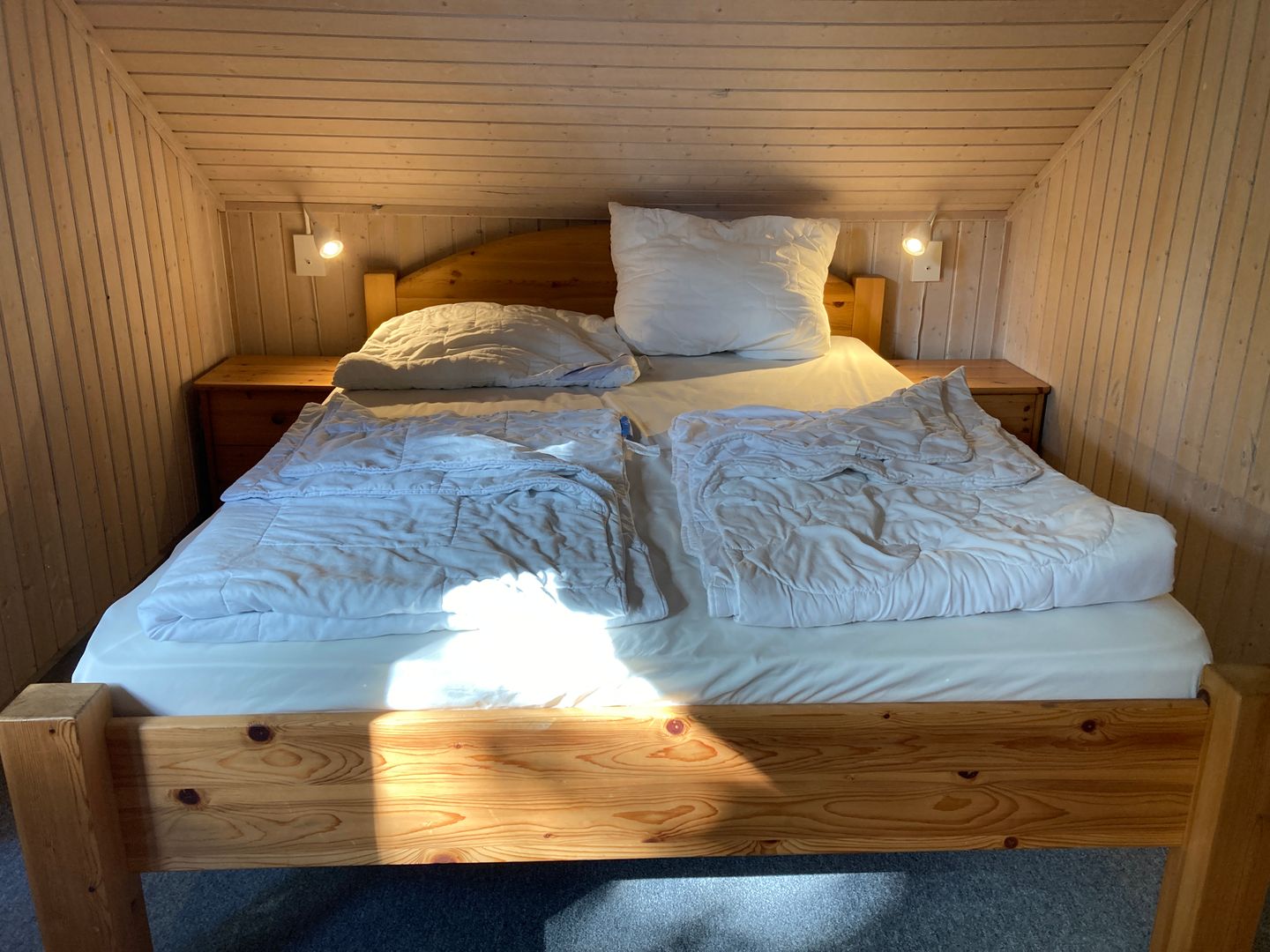 Im Erdgeschoss befindet sich ein Schlafzimmer mit Doppelbett (160 × 200 cm) und Kleiderschrank. Im Obergeschoss stehen ein weiteres Schlafzimmer mit zwei Einzelbetten sowie ein Bett (140 × 200 cm) auf der offenen Galerie zur Verfügung.