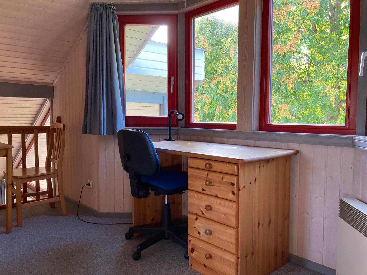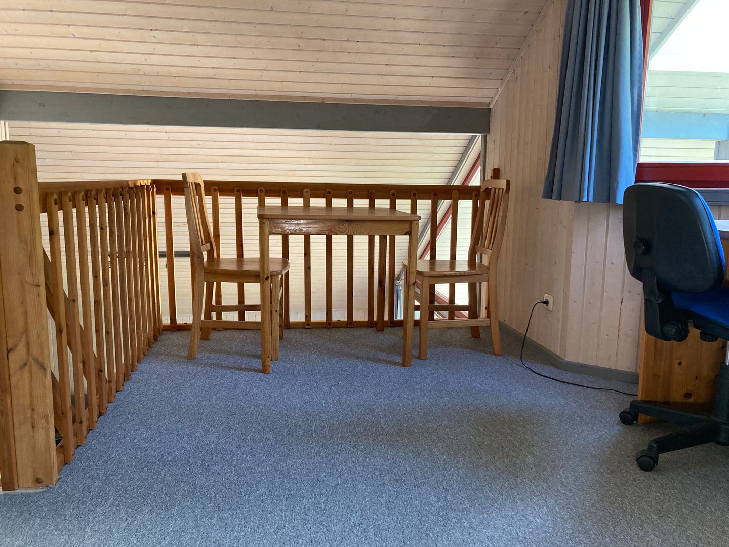 Auf der Empore lädt ein zusätzlicher Tisch mit vier Stühlen zum Spielen oder Verweilen ein; ein Schreibtisch ist dort ebenfalls vorhanden. Vom zweiten Schlafzimmer im Obergeschoss aus ist ein begehbarer Kleiderschrank zugänglich.