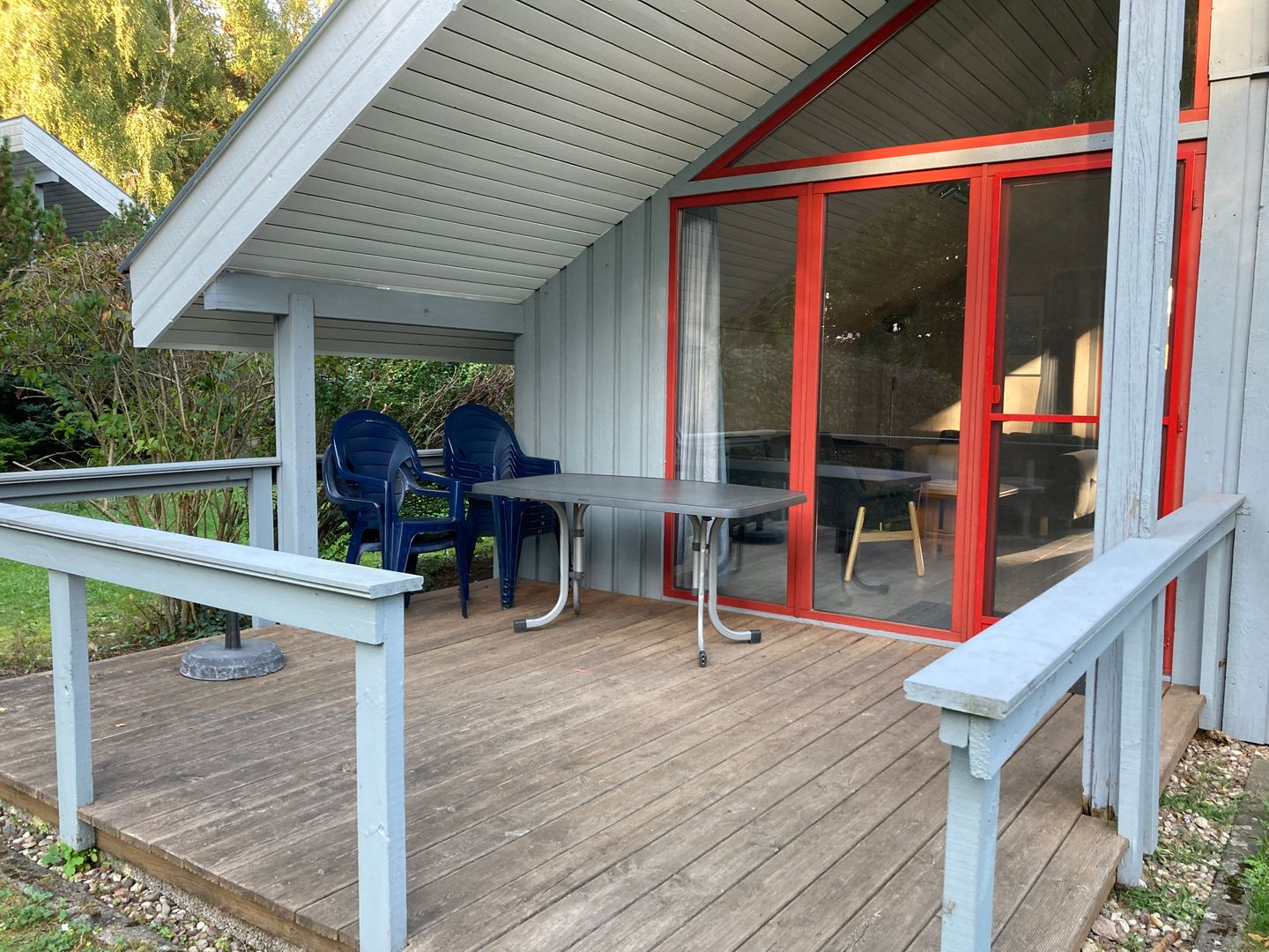 Der Außenbereich bietet eine Terrasse mit Gartenmöbeln, Sonnenschirm und Außengrill. Ein gekennzeichneter PKW-Stellplatz befindet sich direkt am Haus. Neben der Hauseingangstür liegt ein von außen zugänglicher, abschließbarer Abstellraum mit Regalen.