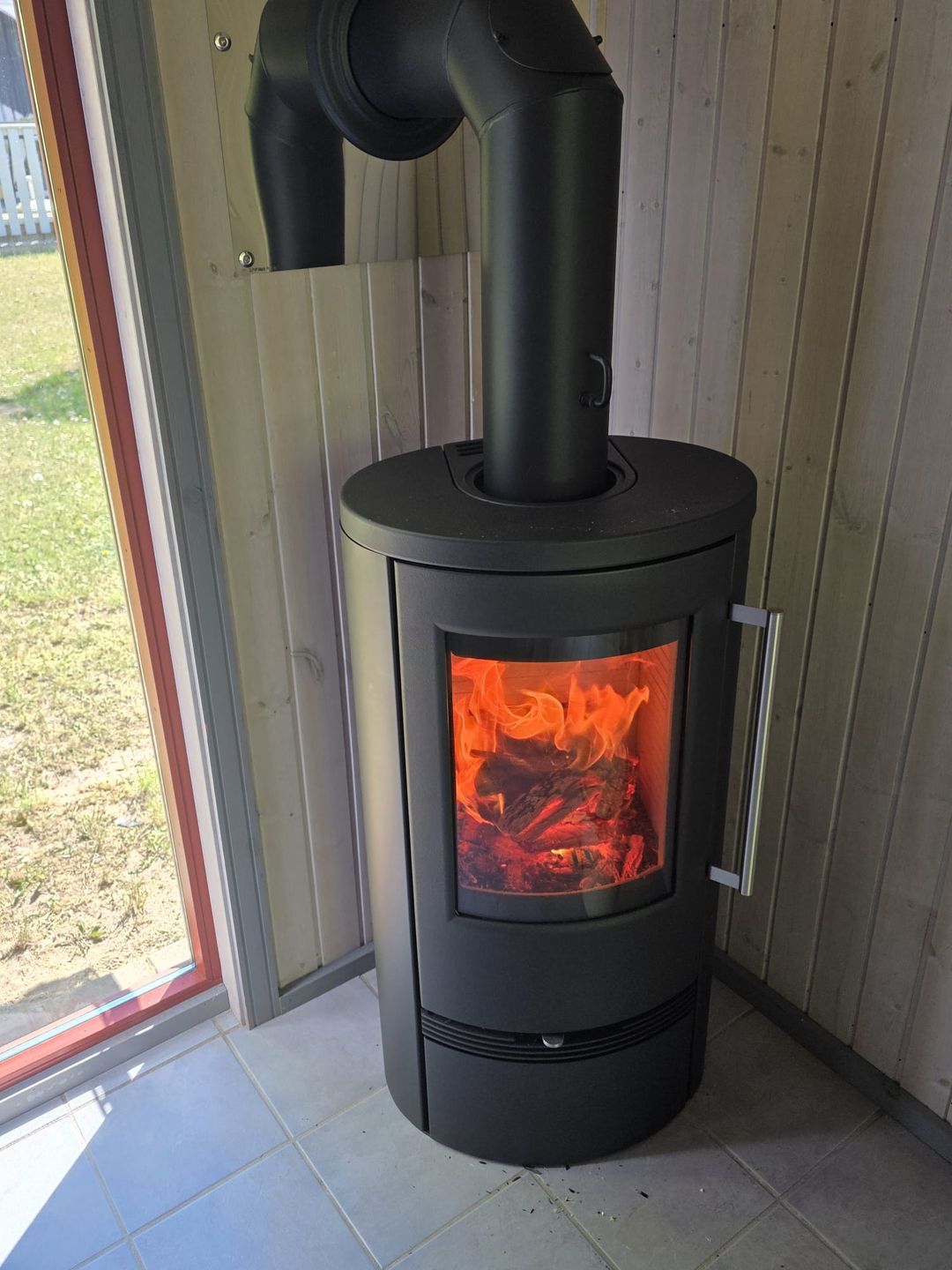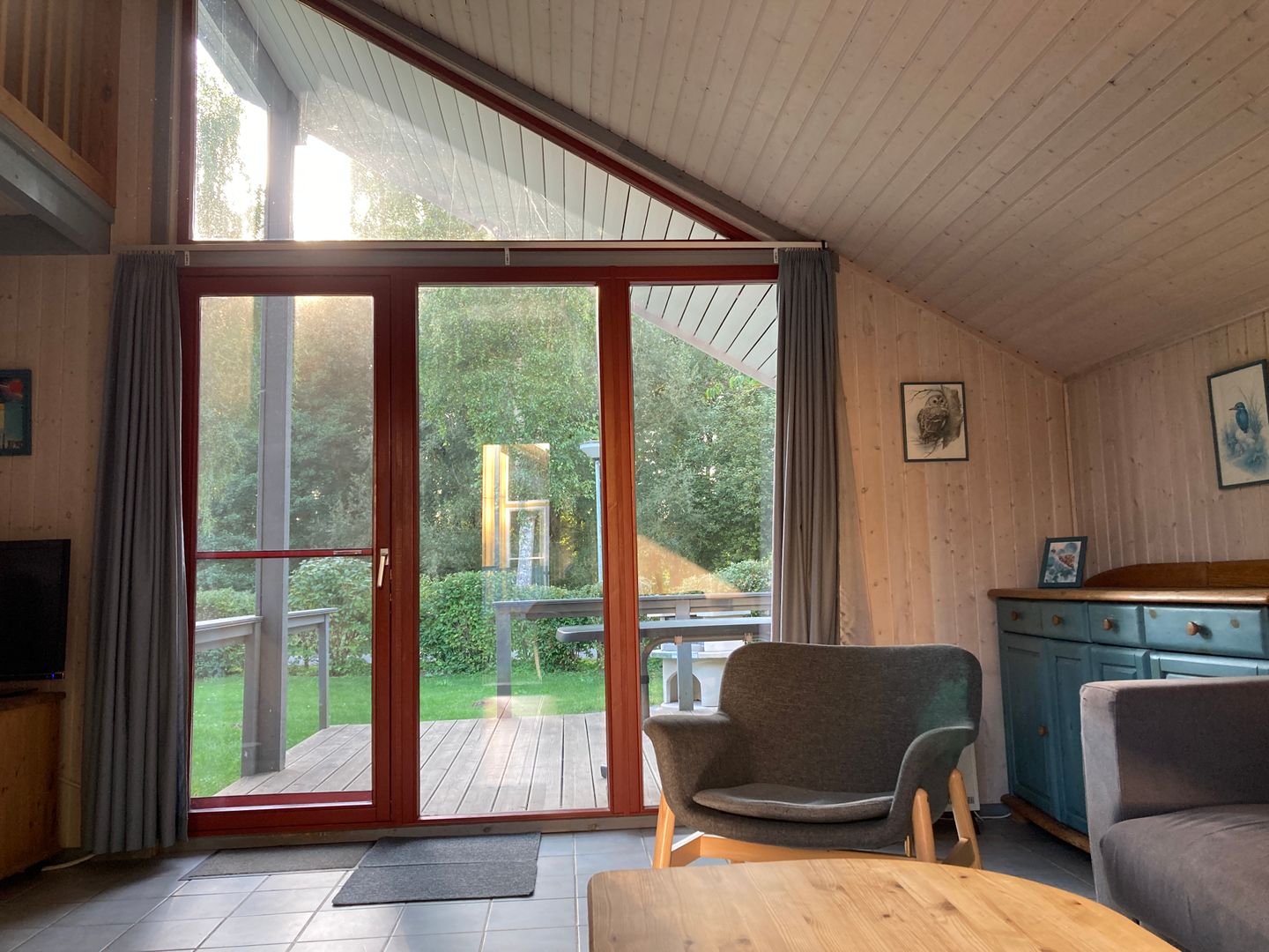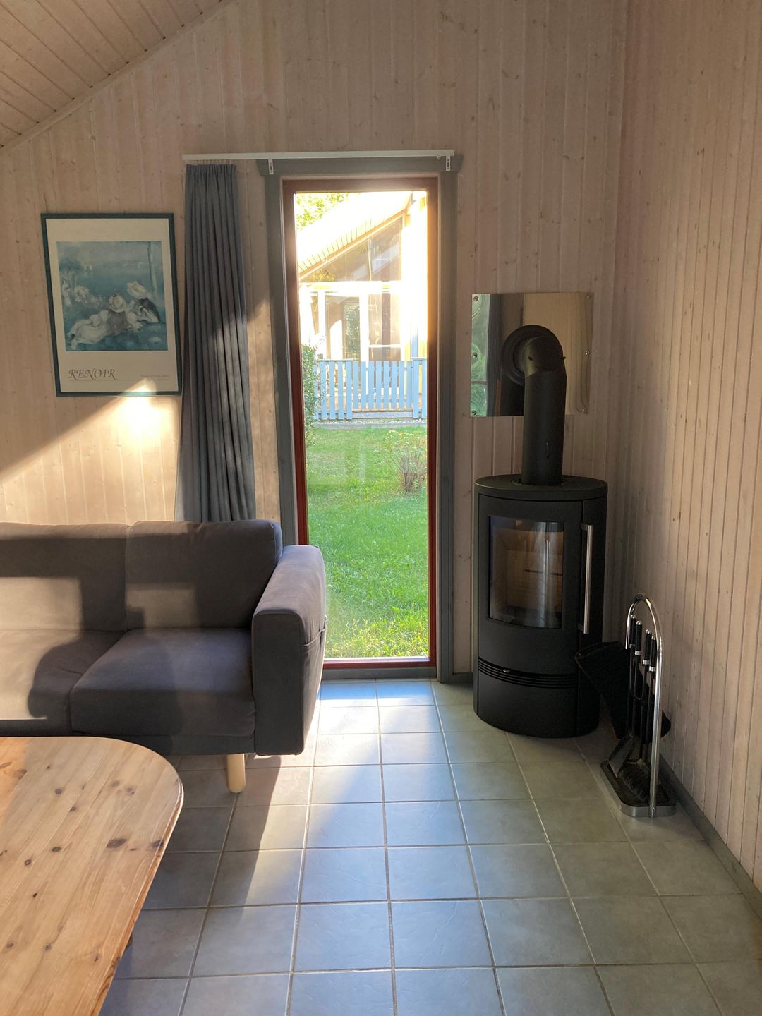 Der lichtdurchflutete Wohnbereich ist mit zwei Sofas, einem Sessel, Couchtisch und Sideboard ausgestattet. Ein moderner Kaminofen (Baujahr 2025) sorgt an kühleren Tagen für eine gemütliche Atmosphäre und ergänzt die elektrische Fußbodenheizung im Wohnbereich. Zur technischen Ausstattung gehören ein 40-Zoll-(100 cm)-SMART-TV mit Internetzugang, ein Blu-ray-DVD-Player sowie eine Musikanlage mit CD-/MP3-Player und USB-Anschluss. Selbstverständlich steht Ihnen kostenfreies WLAN zur Verfügung.