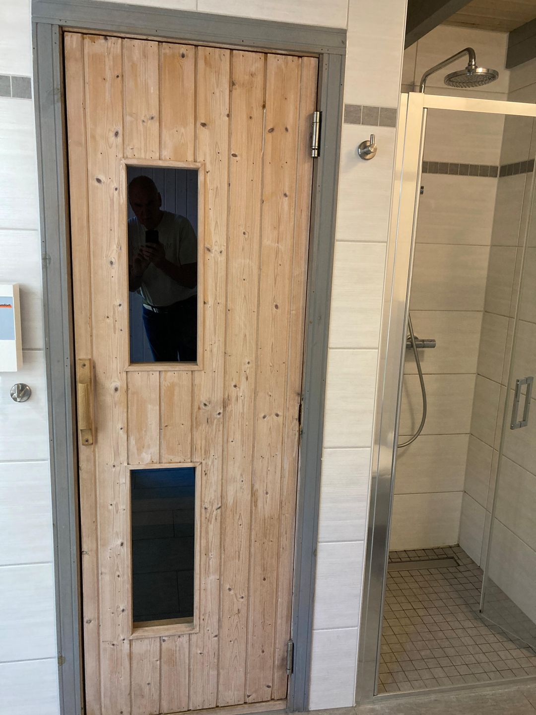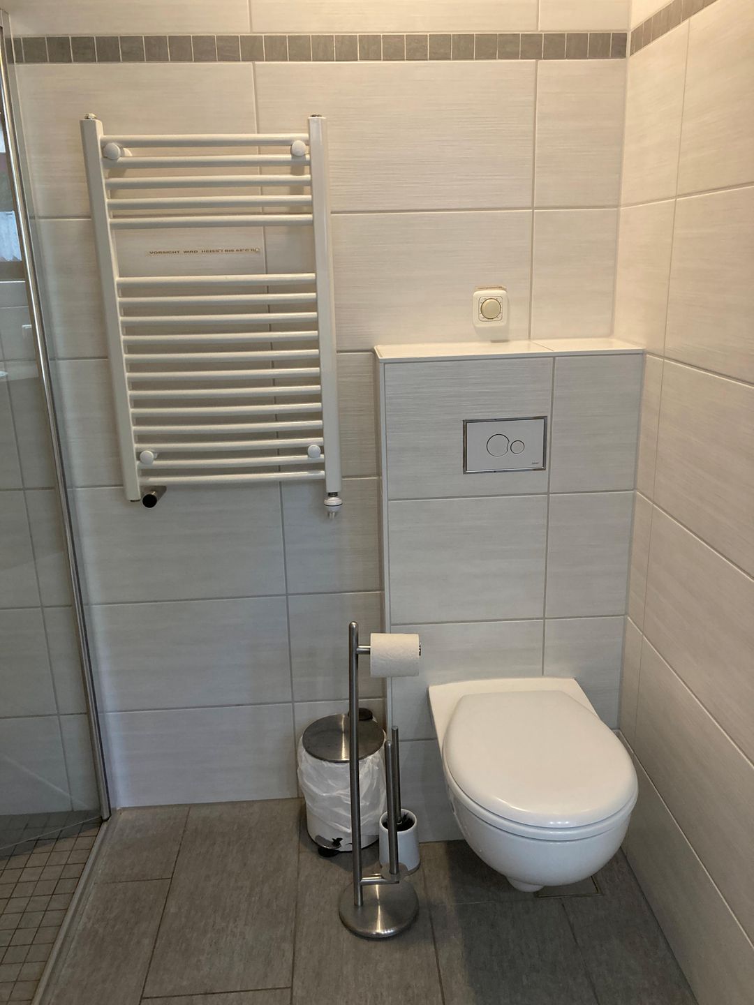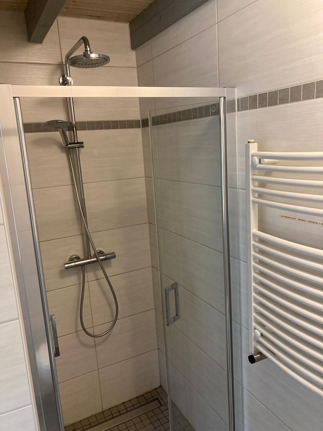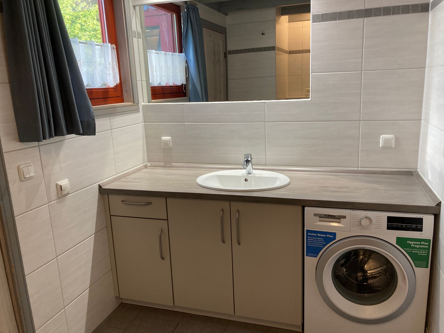 Das im Jahr 2017 komplett neu gestaltete, großzügige Badezimmer verfügt über eine bodengleiche Dusche mit Thermostatarmatur (Regendusche und Handbrause), Fußbodenheizung (auch im Duschbereich), einen beheizbaren Handtuchhalter mit Zeitschaltuhr sowie eine skandinavische Sauna. Unter dem großen Waschtisch stehen praktische Unterschränke zur Verfügung. Zusätzlich befindet sich hier eine moderne Unterbau-Waschmaschine mit einem Fassungsvermögen von bis zu 9 kg.