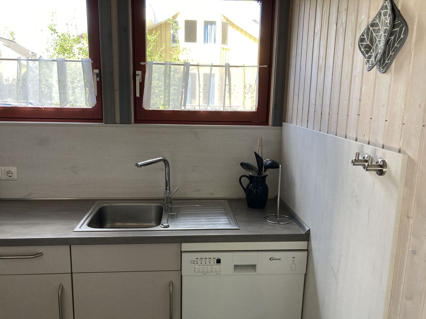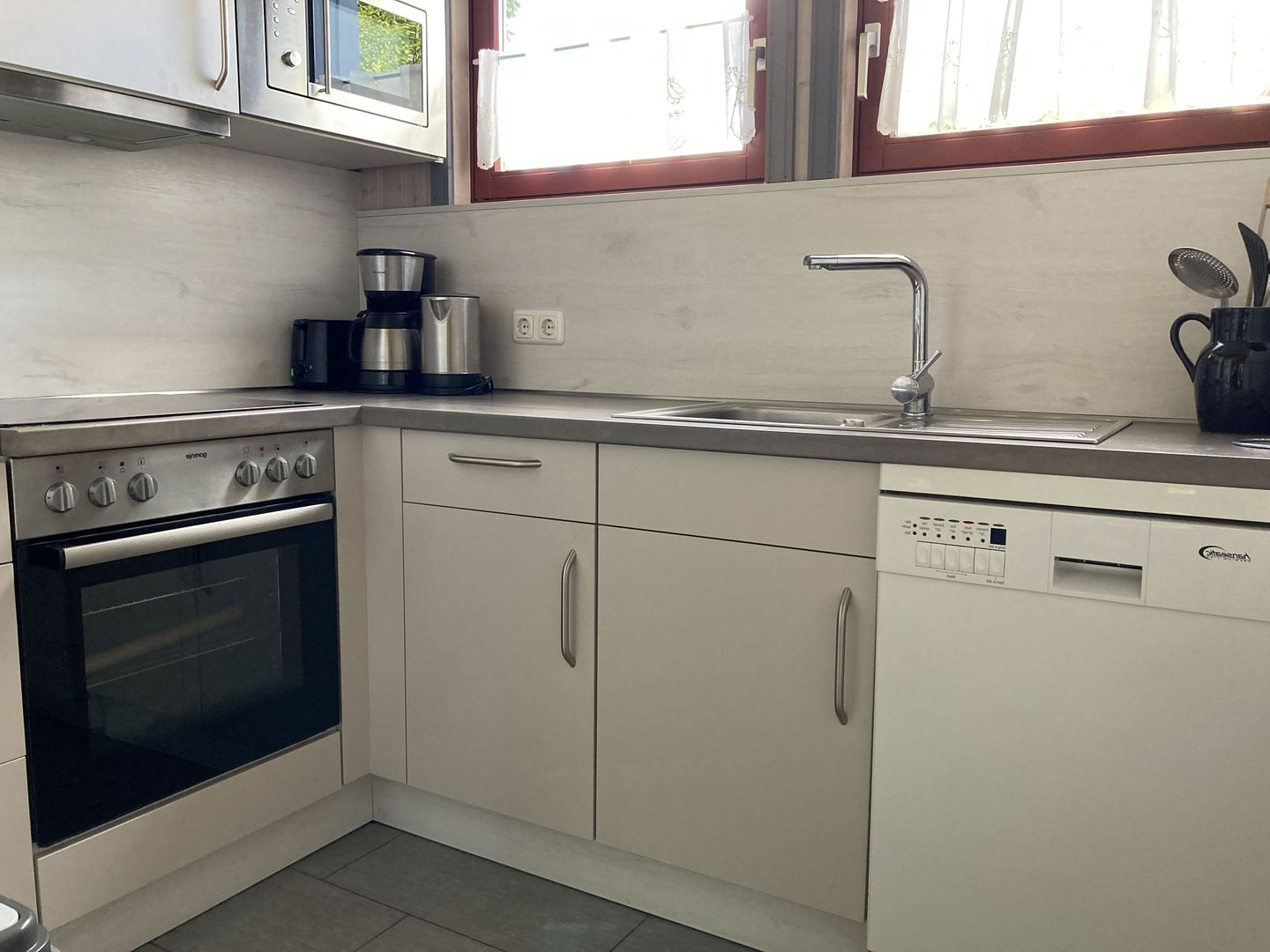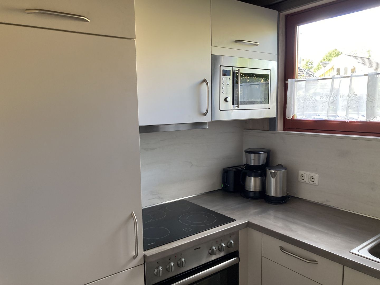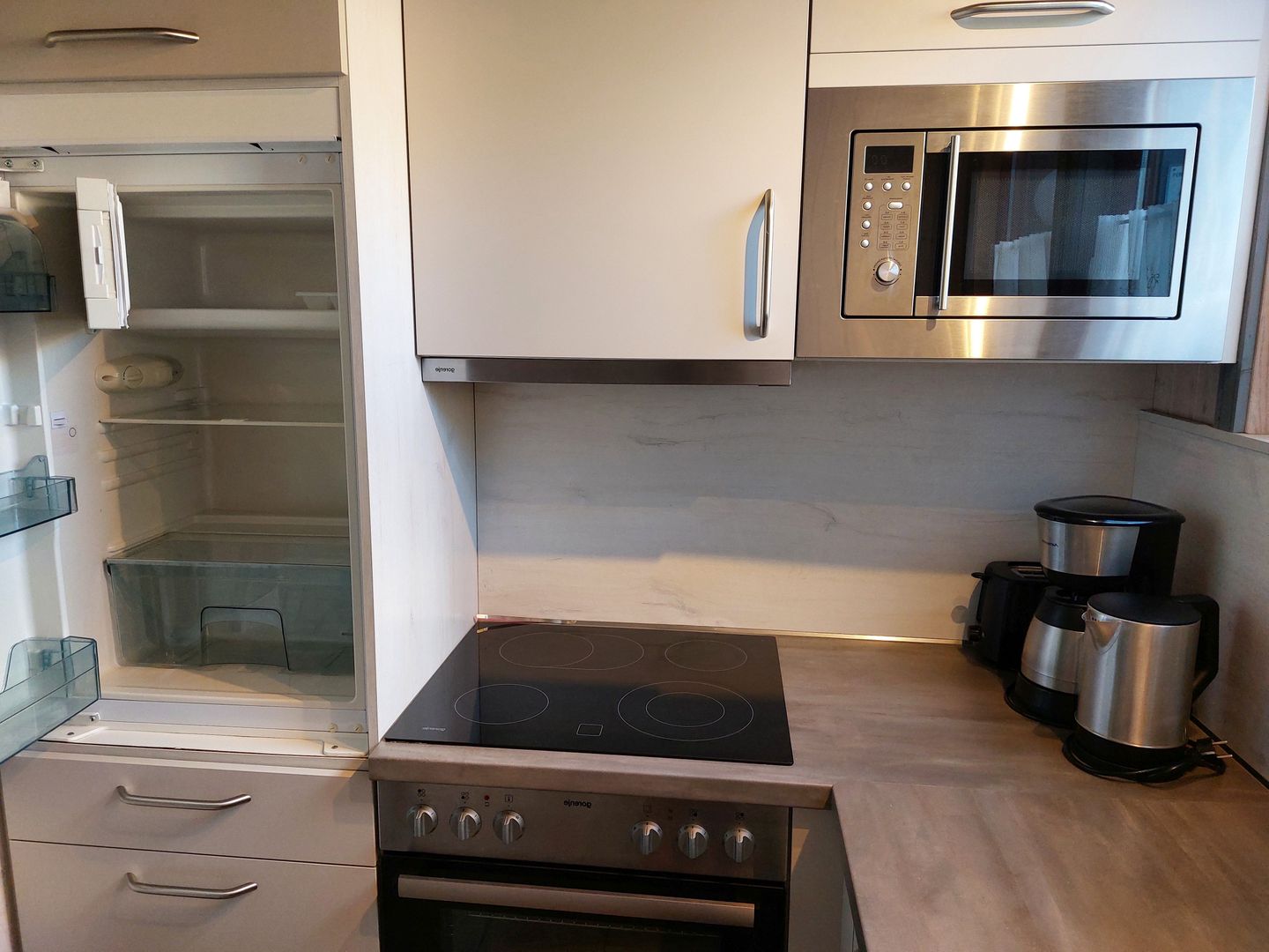 Die moderne Einbauküche ist umfassend ausgestattet mit einem Elektroherd mit Induktionskochfeld und Backofen, einem Kühlschrank mit ****-Gefrierfach, einem Einbau-Geschirrspüler sowie einer Mikrowelle. Kaffeemaschine, Wasserkocher und Toaster gehören ebenfalls zur Ausstattung.