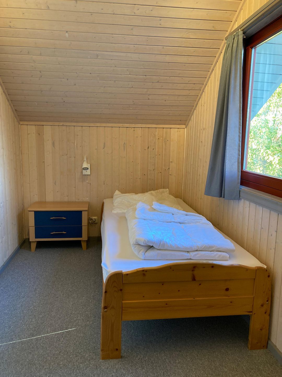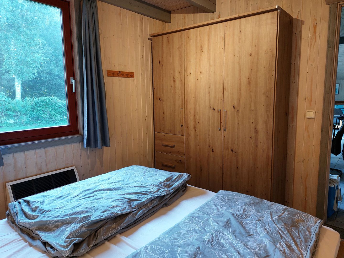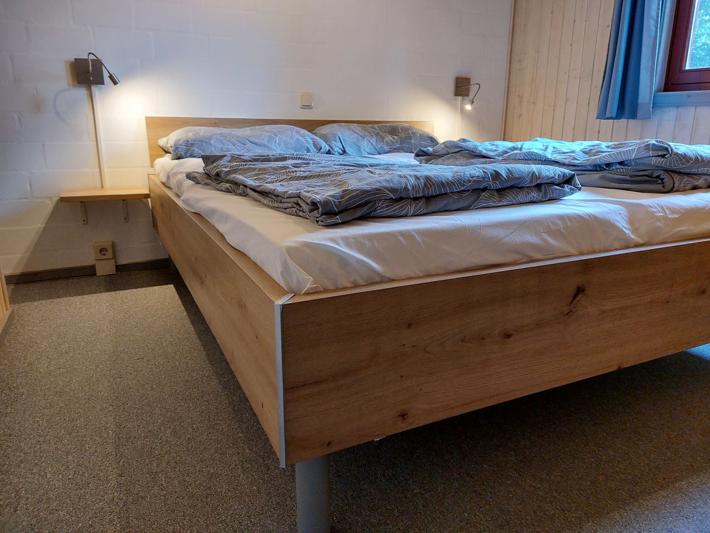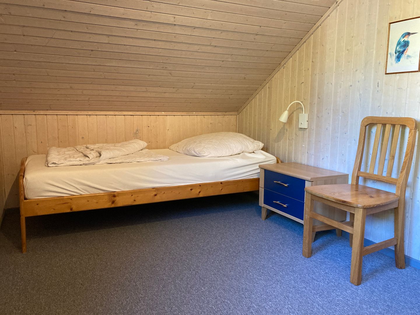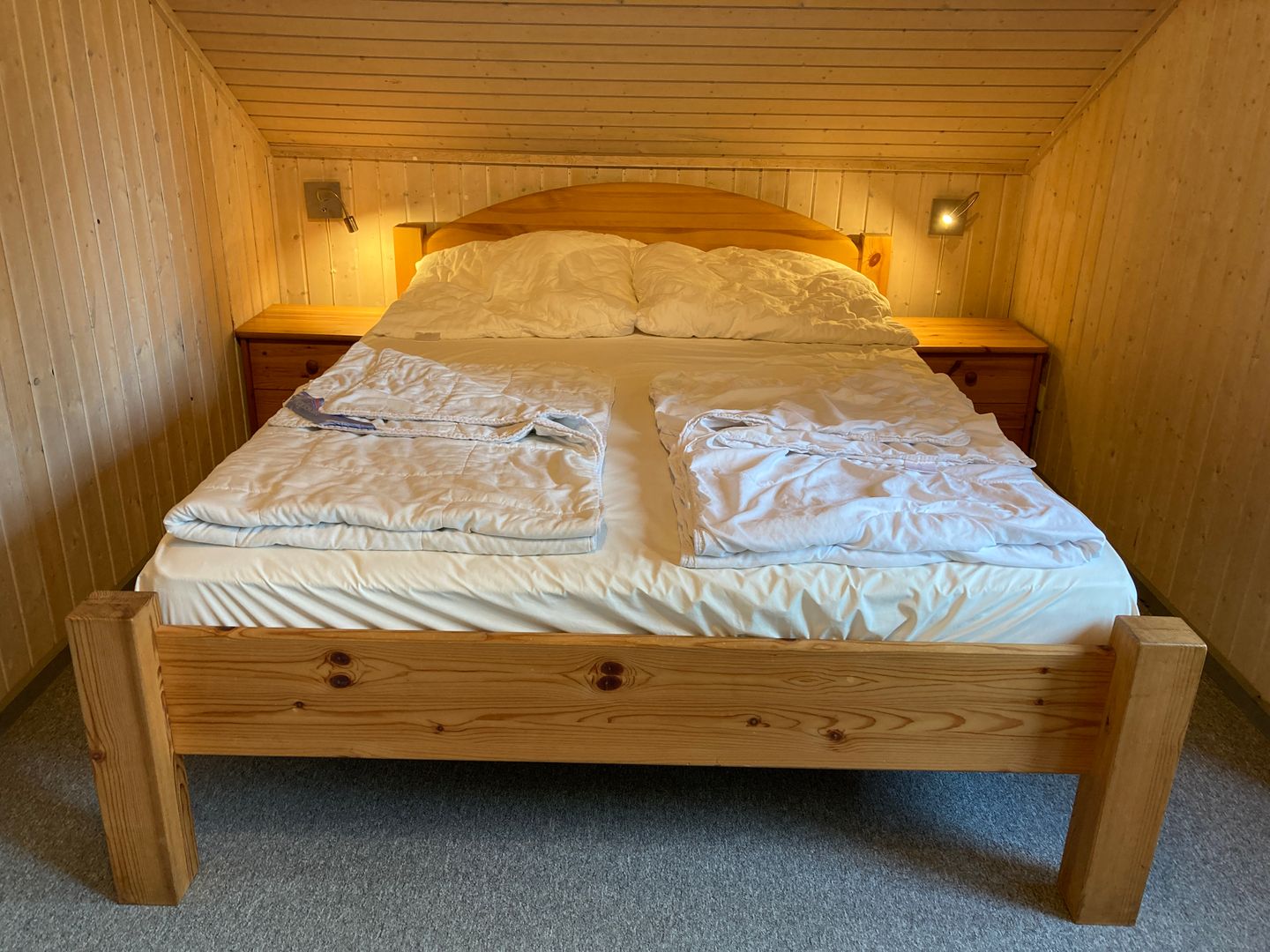Im Erdgeschoss befindet sich ein Schlafzimmer mit Doppelbett (160 × 200 cm) und Kleiderschrank. Im Obergeschoss stehen ein weiteres Schlafzimmer mit zwei Einzelbetten sowie ein Bett (140 × 200 cm) auf der offenen Galerie zur Verfügung.