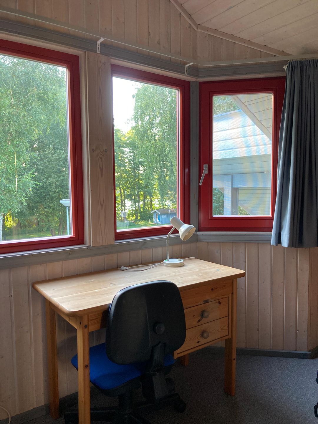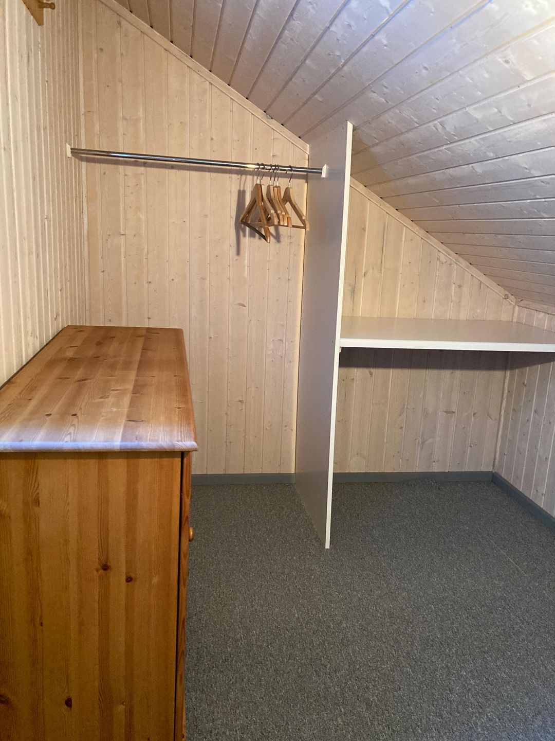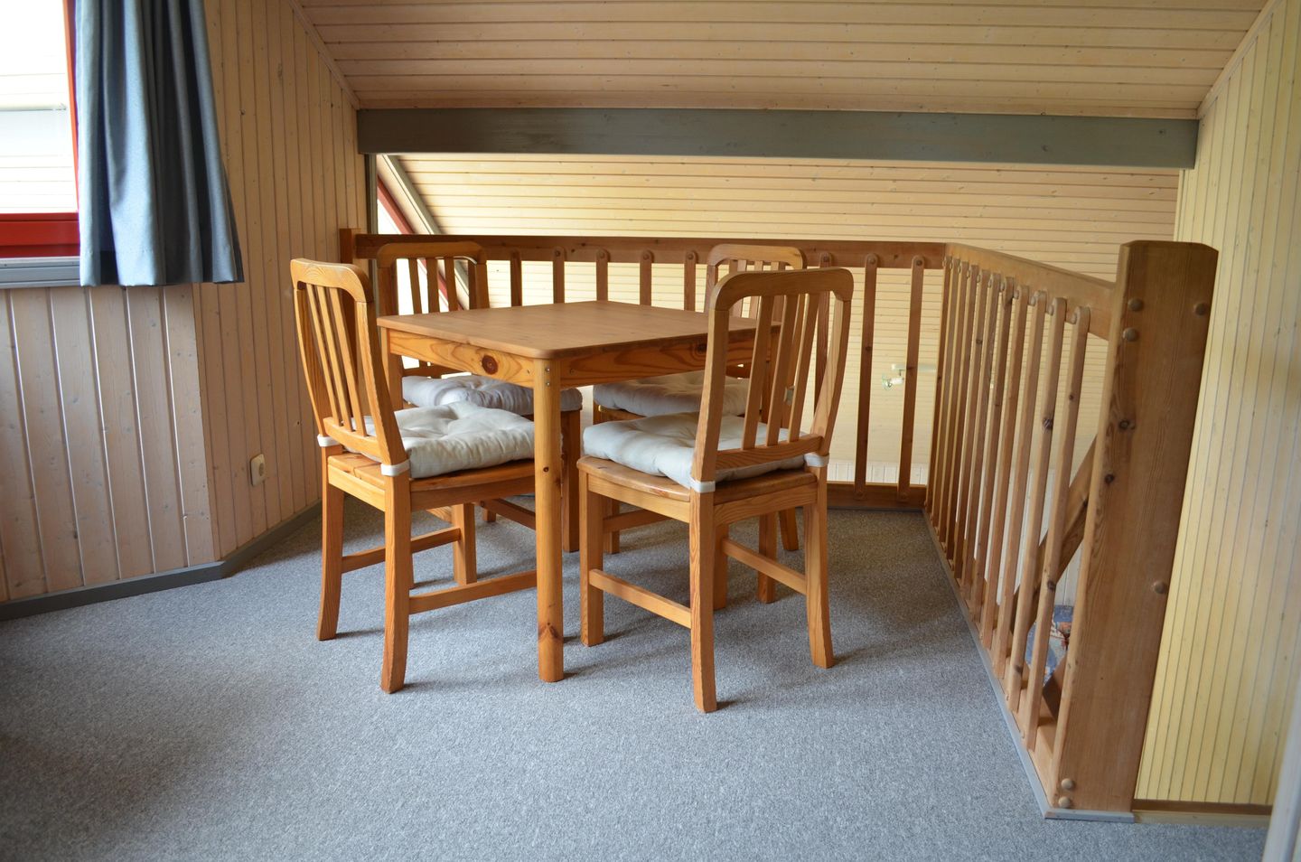 Auf der Empore lädt ein zusätzlicher Tisch mit vier Stühlen zum Spielen oder Verweilen ein; ein Schreibtisch ist dort ebenfalls vorhanden. Vom zweiten Schlafzimmer im Obergeschoss aus ist ein begehbarer Kleiderschrank zugänglich.