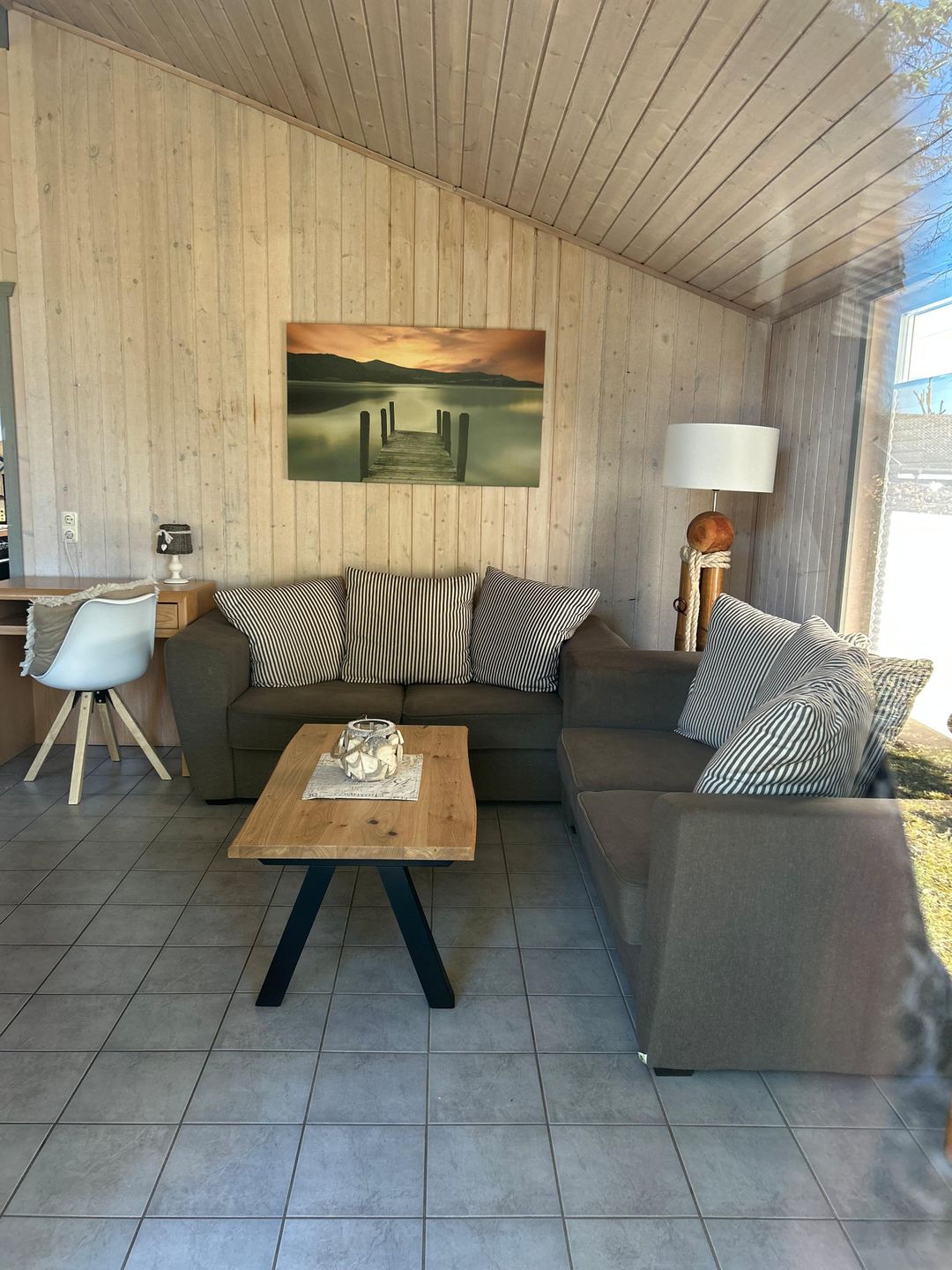 Das Ferienhaus im skandinavischen Stil bietet Platz für bis zu 4 Personen auf einer Etage mit 2 Schlafzimmern, Wohn-/Essbereich, Einbauküche, Badezimmer mit Sauna und Whirlpool, Terrasse und Pkw-Stellplatz.
