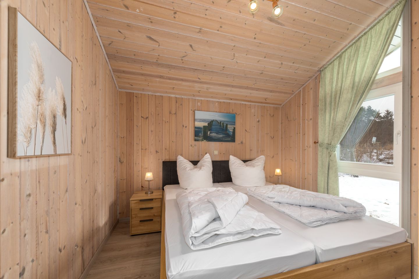 Das Ferienhaus im skandinavischen Stil bietet Platz für bis zu 4 Personen auf einer Etage mit 2 Schlafzimmern, Wohn-/Essbereich, Einbauküche, Badezimmer mit Sauna und Whirlpool, Terrasse und Pkw-Stellplatz.