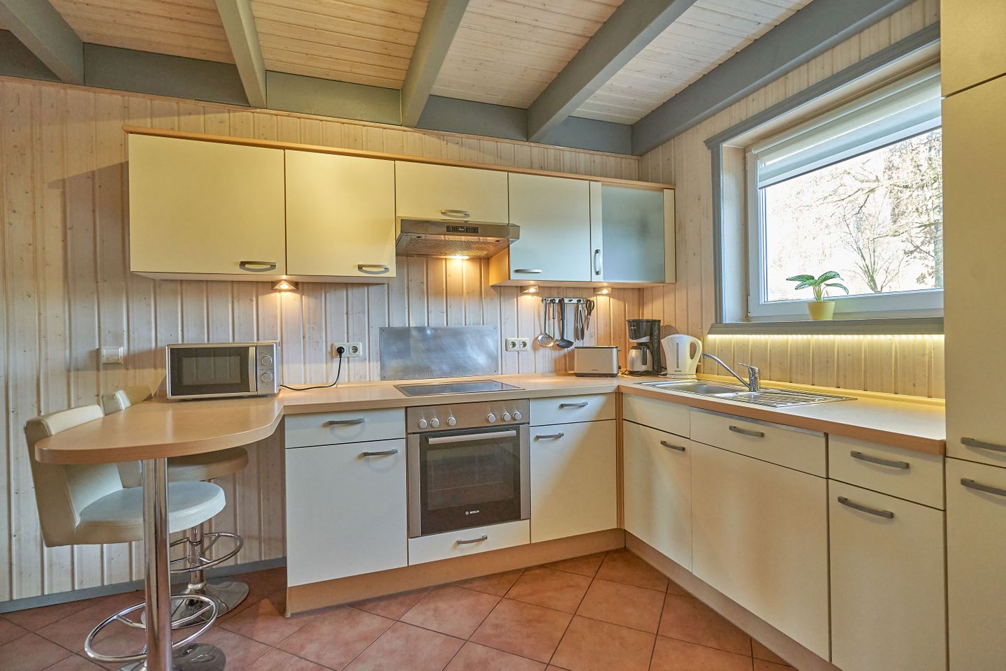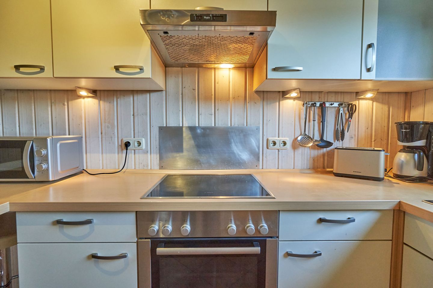 Gemeinsames Kochen macht Spaß in der voll eingerichteten Einbauküche mit Backofen, Ceran-Kochfeld, Kühlschrank mit Tiefkühlfach und Mikrowelle. Ein Geschirrspüler, eine Waschmaschine und ein Wäschetrockner erledigen die Hausarbeit.
