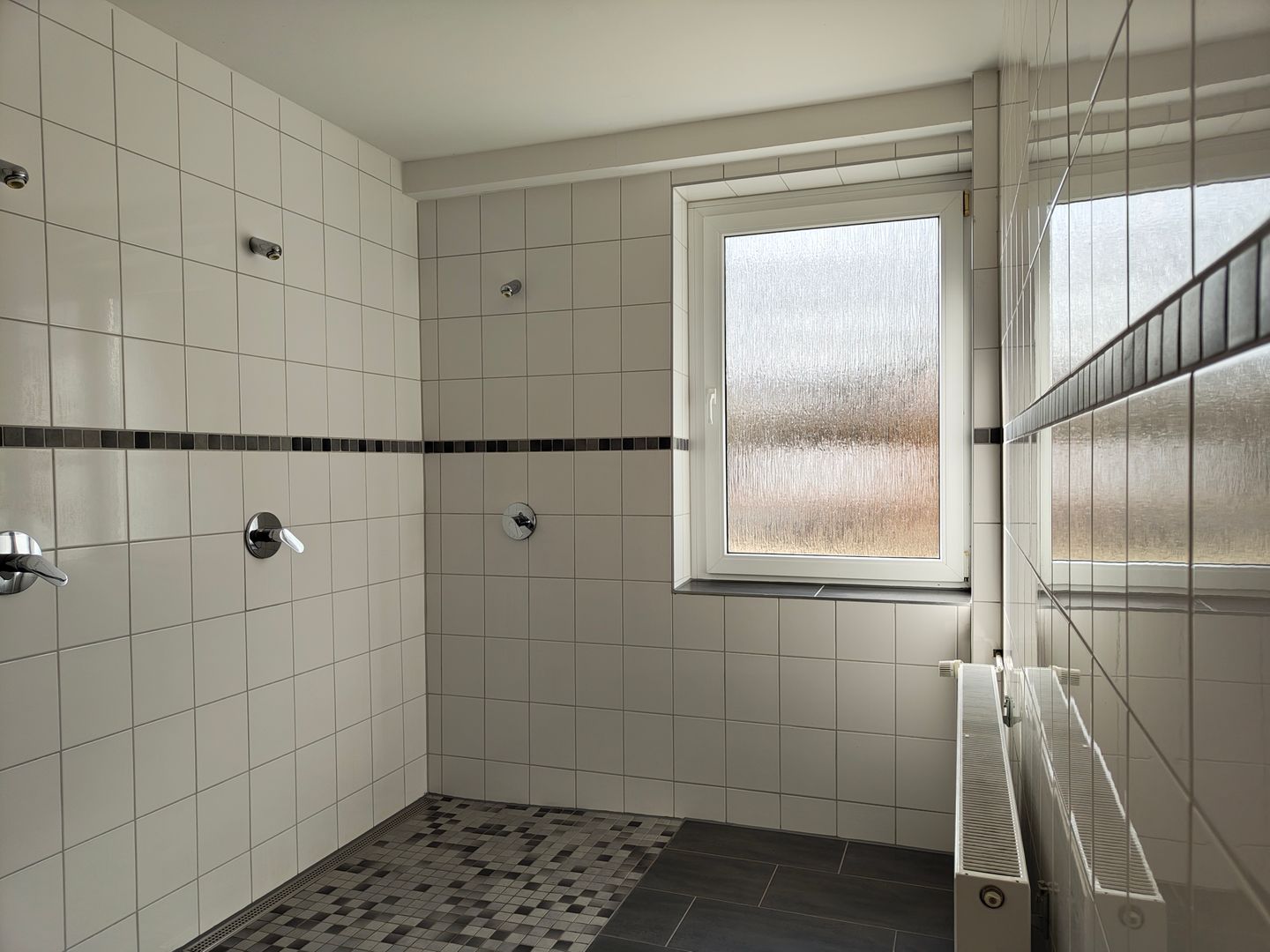 - 2 getrennte Sanitärbereiche (m/w) mit Gemeinschaftsduschen (je 3) und WC-Kabinen (je 2)